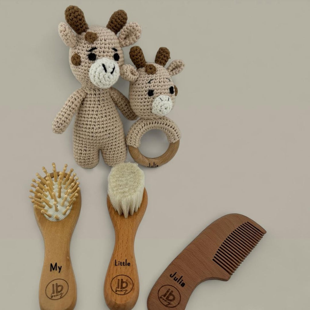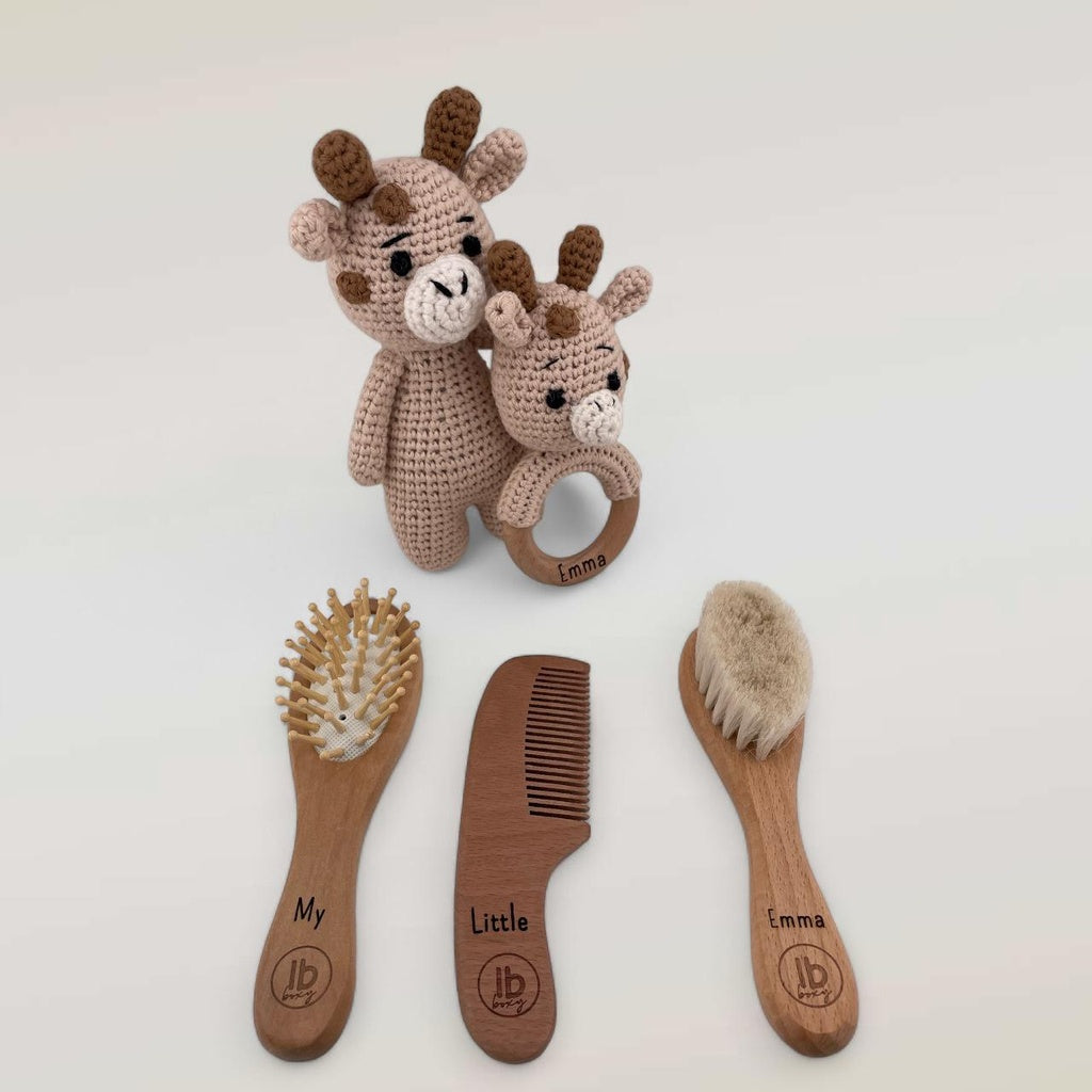 Nandi the giraffe accompanied by her cute rattle, aims to become part of your baby's childhood memories. These lovely magical boxes filled with love are among the most beautiful gifts we can give to the little ones at home, handmade products made from 100% cotton and our 3 beautiful beechwood brushes that you can personalize.